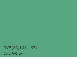 RYB 89,141,167 Color is a normal green color and the nearest color is Shiny Shamrock #5fa778. Hex code #59a780 and RGB value is rgb(89,167,128). In RGB color space, this color is composed of 35% red, 65% green, 50% blue, In CMYK color space, this color is composed of 47% cyan, 0% magenta, 23% yellow , 35% black , In HSL color space, this color has a hue angle of 150° , 31% saturation and 50% lightness.