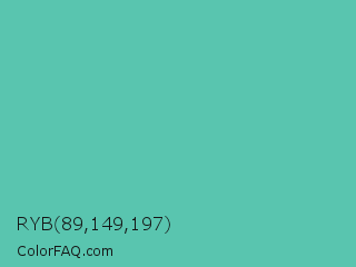 RYB 89,149,197 Color is a normal cyan color and the nearest color is Tradewind #5fb3ac. Hex code #59c5af and RGB value is rgb(89,197,175). In RGB color space, this color is composed of 35% red, 77% green, 69% blue, In CMYK color space, this color is composed of 55% cyan, 0% magenta, 11% yellow , 23% black , In HSL color space, this color has a hue angle of 168° , 48% saturation and 56% lightness.