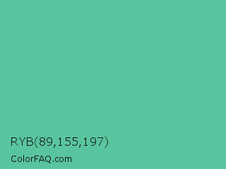 RYB 89,155,197 Color is a normal green color and the nearest color is Ocean Green #48bf91. Hex code #59c59e and RGB value is rgb(89,197,158). In RGB color space, this color is composed of 35% red, 77% green, 62% blue, In CMYK color space, this color is composed of 55% cyan, 0% magenta, 20% yellow , 23% black , In HSL color space, this color has a hue angle of 158° , 48% saturation and 56% lightness.
