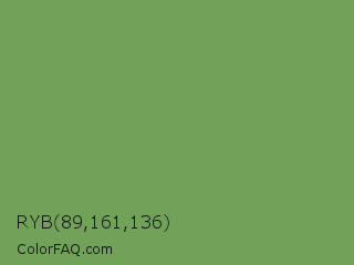 RYB 89,161,136 Color is a normal green color and the nearest color is Asparagus Green #7ba05b. Hex code #72a159 and RGB value is rgb(114,161,89). In RGB color space, this color is composed of 45% red, 63% green, 35% blue, In CMYK color space, this color is composed of 29% cyan, 0% magenta, 45% yellow , 37% black , In HSL color space, this color has a hue angle of 99° , 29% saturation and 49% lightness.