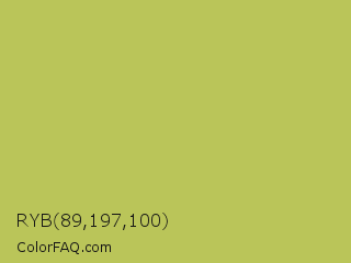 RYB 89,197,100 Color is a normal yellow color and the nearest color is Celery #b8c25d. Hex code #bac559 and RGB value is rgb(186,197,89). In RGB color space, this color is composed of 73% red, 77% green, 35% blue, In CMYK color space, this color is composed of 6% cyan, 0% magenta, 55% yellow , 23% black , In HSL color space, this color has a hue angle of 66° , 48% saturation and 56% lightness.