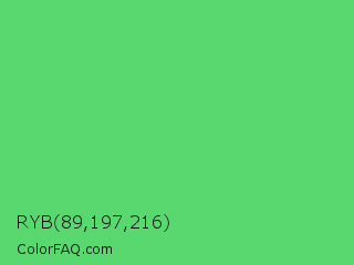 RYB 89,197,216 Color is a normal green color and the nearest color is Emerald #50c878. Hex code #59d86f and RGB value is rgb(89,216,111). In RGB color space, this color is composed of 35% red, 85% green, 44% blue, In CMYK color space, this color is composed of 59% cyan, 0% magenta, 49% yellow , 15% black , In HSL color space, this color has a hue angle of 130° , 62% saturation and 60% lightness.