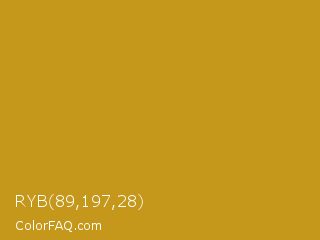 RYB 89,197,28 Color is a normal orange color and the nearest color is Nugget #c59922. Hex code #c5981c and RGB value is rgb(197,152,28). In RGB color space, this color is composed of 77% red, 60% green, 11% blue, In CMYK color space, this color is composed of 0% cyan, 23% magenta, 86% yellow , 23% black , In HSL color space, this color has a hue angle of 44° , 75% saturation and 44% lightness.