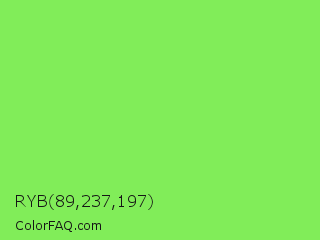 RYB 89,237,197 Color is a light green color and the nearest color is Kiwi #8ee53f. Hex code #81ed59 and RGB value is rgb(129,237,89). In RGB color space, this color is composed of 51% red, 93% green, 35% blue, In CMYK color space, this color is composed of 46% cyan, 0% magenta, 62% yellow , 7% black , In HSL color space, this color has a hue angle of 104° , 80% saturation and 64% lightness.