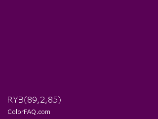 RYB 89,2,85 Color is a very dark magenta color and the nearest color is Clairvoyant #480656. Hex code #590255 and RGB value is rgb(89,2,85). In RGB color space, this color is composed of 35% red, 1% green, 33% blue, In CMYK color space, this color is composed of 0% cyan, 98% magenta, 4% yellow , 65% black , In HSL color space, this color has a hue angle of 303° , 96% saturation and 18% lightness.