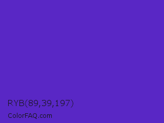 RYB 89,39,197 Color is a normal indigo color and the nearest color is Purple Heart Crayola #652dc1. Hex code #5927c5 and RGB value is rgb(89,39,197). In RGB color space, this color is composed of 35% red, 15% green, 77% blue, In CMYK color space, this color is composed of 55% cyan, 80% magenta, 0% yellow , 23% black , In HSL color space, this color has a hue angle of 259° , 67% saturation and 46% lightness.