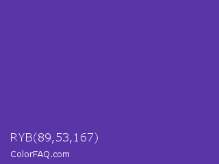 RYB 89,53,167 Color is a normal indigo color and the nearest color is Rebecca Purple #663399. Hex code #5935a7 and RGB value is rgb(89,53,167). In RGB color space, this color is composed of 35% red, 21% green, 65% blue, In CMYK color space, this color is composed of 47% cyan, 68% magenta, 0% yellow , 35% black , In HSL color space, this color has a hue angle of 259° , 52% saturation and 43% lightness.