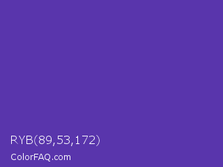 RYB 89,53,172 Color is a normal indigo color and the nearest color is Plump Purple #5946b2. Hex code #5935ac and RGB value is rgb(89,53,172). In RGB color space, this color is composed of 35% red, 21% green, 67% blue, In CMYK color space, this color is composed of 48% cyan, 69% magenta, 0% yellow , 33% black , In HSL color space, this color has a hue angle of 258° , 53% saturation and 44% lightness.