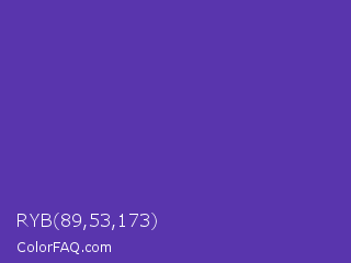 RYB 89,53,173 Color is a normal indigo color and the nearest color is Plump Purple #5946b2. Hex code #5935ad and RGB value is rgb(89,53,173). In RGB color space, this color is composed of 35% red, 21% green, 68% blue, In CMYK color space, this color is composed of 49% cyan, 69% magenta, 0% yellow , 32% black , In HSL color space, this color has a hue angle of 258° , 53% saturation and 44% lightness.
