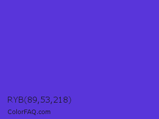 RYB 89,53,218 Color is a normal indigo color and the nearest color is Majorelle Blue #6050dc. Hex code #5935da and RGB value is rgb(89,53,218). In RGB color space, this color is composed of 35% red, 21% green, 85% blue, In CMYK color space, this color is composed of 59% cyan, 76% magenta, 0% yellow , 15% black , In HSL color space, this color has a hue angle of 253° , 69% saturation and 53% lightness.