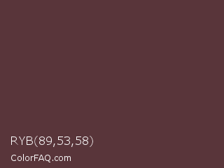 RYB 89,53,58 Color is a dark red color and the nearest color is Congo Brown #593737. Hex code #59353a and RGB value is rgb(89,53,58). In RGB color space, this color is composed of 35% red, 21% green, 23% blue, In CMYK color space, this color is composed of 0% cyan, 40% magenta, 35% yellow , 65% black , In HSL color space, this color has a hue angle of 352° , 25% saturation and 28% lightness.