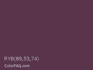 RYB 89,53,74 Color is a dark magenta color and the nearest color is Dark Byzantium #5d3954. Hex code #59354a and RGB value is rgb(89,53,74). In RGB color space, this color is composed of 35% red, 21% green, 29% blue, In CMYK color space, this color is composed of 0% cyan, 40% magenta, 17% yellow , 65% black , In HSL color space, this color has a hue angle of 325° , 25% saturation and 28% lightness.