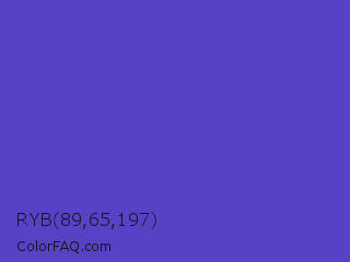 RYB 89,65,197 Color is a normal indigo color and the nearest color is Iris #5a4fcf. Hex code #5941c5 and RGB value is rgb(89,65,197). In RGB color space, this color is composed of 35% red, 25% green, 77% blue, In CMYK color space, this color is composed of 55% cyan, 67% magenta, 0% yellow , 23% black , In HSL color space, this color has a hue angle of 251° , 53% saturation and 51% lightness.