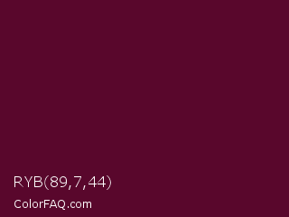 RYB 89,7,44 Color is a very dark rose color and the nearest color is Mulberry Wood #5c0536. Hex code #59072c and RGB value is rgb(89,7,44). In RGB color space, this color is composed of 35% red, 3% green, 17% blue, In CMYK color space, this color is composed of 0% cyan, 92% magenta, 51% yellow , 65% black , In HSL color space, this color has a hue angle of 333° , 85% saturation and 19% lightness.