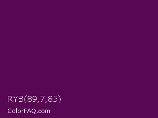 RYB 89,7,85 Color is a very dark magenta color and the nearest color is Clairvoyant #480656. Hex code #590755 and RGB value is rgb(89,7,85). In RGB color space, this color is composed of 35% red, 3% green, 33% blue, In CMYK color space, this color is composed of 0% cyan, 92% magenta, 4% yellow , 65% black , In HSL color space, this color has a hue angle of 303° , 85% saturation and 19% lightness.