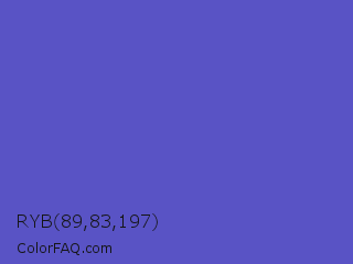 RYB 89,83,197 Color is a normal indigo color and the nearest color is Iris #5a4fcf. Hex code #5953c5 and RGB value is rgb(89,83,197). In RGB color space, this color is composed of 35% red, 33% green, 77% blue, In CMYK color space, this color is composed of 55% cyan, 58% magenta, 0% yellow , 23% black , In HSL color space, this color has a hue angle of 243° , 50% saturation and 55% lightness.