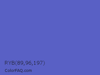 RYB 89,96,197 Color is a normal blue color and the nearest color is Indigo #4f69c6. Hex code #5960c5 and RGB value is rgb(89,96,197). In RGB color space, this color is composed of 35% red, 38% green, 77% blue, In CMYK color space, this color is composed of 55% cyan, 51% magenta, 0% yellow , 23% black , In HSL color space, this color has a hue angle of 236° , 48% saturation and 56% lightness.