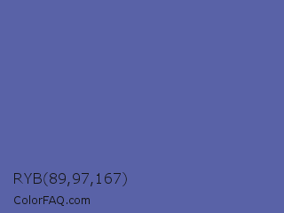 RYB 89,97,167 Color is a normal blue color and the nearest color is Liberty #545aa7. Hex code #5962a7 and RGB value is rgb(89,98,167). In RGB color space, this color is composed of 35% red, 38% green, 65% blue, In CMYK color space, this color is composed of 47% cyan, 41% magenta, 0% yellow , 35% black , In HSL color space, this color has a hue angle of 233° , 31% saturation and 50% lightness.