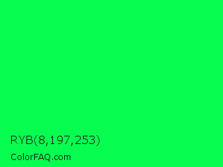 RYB 8,197,253 Color is a normal green color and the nearest color is Malachite #0bda51. Hex code #08fd51 and RGB value is rgb(8,253,81). In RGB color space, this color is composed of 3% red, 99% green, 32% blue, In CMYK color space, this color is composed of 97% cyan, 0% magenta, 68% yellow , 1% black , In HSL color space, this color has a hue angle of 138° , 98% saturation and 51% lightness.