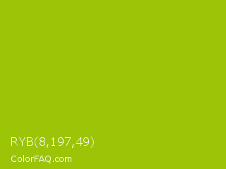 RYB 8,197,49 Color is a normal lime color and the nearest color is Pistachio Green #9dc209. Hex code #9cc508 and RGB value is rgb(156,197,8). In RGB color space, this color is composed of 61% red, 77% green, 3% blue, In CMYK color space, this color is composed of 21% cyan, 0% magenta, 96% yellow , 23% black , In HSL color space, this color has a hue angle of 73° , 92% saturation and 40% lightness.