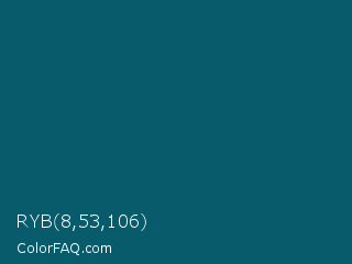 RYB 8,53,106 Color is a very dark cyan color and the nearest color is Blue Stone #016162. Hex code #085b6a and RGB value is rgb(8,91,106). In RGB color space, this color is composed of 3% red, 36% green, 42% blue, In CMYK color space, this color is composed of 92% cyan, 14% magenta, 0% yellow , 58% black , In HSL color space, this color has a hue angle of 189° , 86% saturation and 22% lightness.