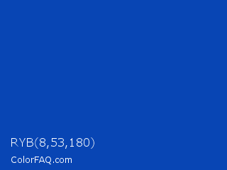 RYB 8,53,180 Color is a normal blue color and the nearest color is Absolute Zero #0048ba. Hex code #0845b4 and RGB value is rgb(8,69,180). In RGB color space, this color is composed of 3% red, 27% green, 71% blue, In CMYK color space, this color is composed of 96% cyan, 62% magenta, 0% yellow , 29% black , In HSL color space, this color has a hue angle of 219° , 91% saturation and 37% lightness.