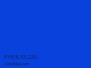 RYB 8,53,220 Color is a normal blue color and the nearest color is Palatinate Blue #273be2. Hex code #0841dc and RGB value is rgb(8,65,220). In RGB color space, this color is composed of 3% red, 25% green, 86% blue, In CMYK color space, this color is composed of 96% cyan, 70% magenta, 0% yellow , 14% black , In HSL color space, this color has a hue angle of 224° , 93% saturation and 45% lightness.