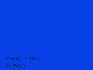 RYB 8,53,231 Color is a normal blue color and the nearest color is Blue RYB #0247fe. Hex code #0840e7 and RGB value is rgb(8,64,231). In RGB color space, this color is composed of 3% red, 25% green, 91% blue, In CMYK color space, this color is composed of 97% cyan, 72% magenta, 0% yellow , 9% black , In HSL color space, this color has a hue angle of 225° , 93% saturation and 47% lightness.