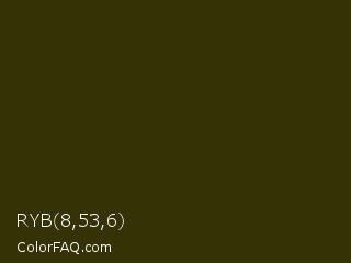 RYB 8,53,6 Color is a very dark yellow color and the nearest color is Madras #3f3002. Hex code #353306 and RGB value is rgb(53,51,6). In RGB color space, this color is composed of 21% red, 20% green, 2% blue, In CMYK color space, this color is composed of 0% cyan, 4% magenta, 89% yellow , 79% black , In HSL color space, this color has a hue angle of 57° , 80% saturation and 12% lightness.