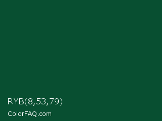RYB 8,53,79 Color is a very dark green color and the nearest color is Sherwood Green #02402c. Hex code #084f31 and RGB value is rgb(8,79,49). In RGB color space, this color is composed of 3% red, 31% green, 19% blue, In CMYK color space, this color is composed of 90% cyan, 0% magenta, 38% yellow , 69% black , In HSL color space, this color has a hue angle of 155° , 82% saturation and 17% lightness.