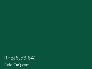 RYB 8,53,84 Color is a very dark green color and the nearest color is Sacramento State Green #00563f. Hex code #08543c and RGB value is rgb(8,84,60). In RGB color space, this color is composed of 3% red, 33% green, 24% blue, In CMYK color space, this color is composed of 90% cyan, 0% magenta, 29% yellow , 67% black , In HSL color space, this color has a hue angle of 161° , 83% saturation and 18% lightness.