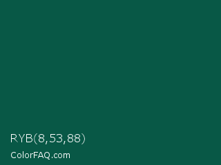 RYB 8,53,88 Color is a very dark cyan color and the nearest color is Sacramento State Green #00563f. Hex code #085846 and RGB value is rgb(8,88,70). In RGB color space, this color is composed of 3% red, 35% green, 27% blue, In CMYK color space, this color is composed of 91% cyan, 0% magenta, 20% yellow , 65% black , In HSL color space, this color has a hue angle of 167° , 83% saturation and 19% lightness.