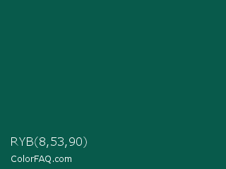 RYB 8,53,90 Color is a very dark cyan color and the nearest color is Eden #105852. Hex code #085a4b and RGB value is rgb(8,90,75). In RGB color space, this color is composed of 3% red, 35% green, 29% blue, In CMYK color space, this color is composed of 91% cyan, 0% magenta, 17% yellow , 65% black , In HSL color space, this color has a hue angle of 169° , 84% saturation and 19% lightness.