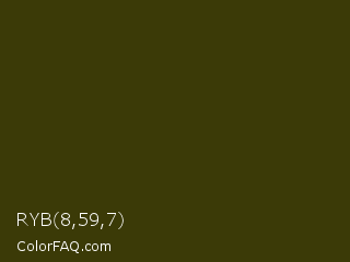 RYB 8,59,7 Color is a very dark yellow color and the nearest color is Waiouru #363c0d. Hex code #3b3a07 and RGB value is rgb(59,58,7). In RGB color space, this color is composed of 23% red, 23% green, 3% blue, In CMYK color space, this color is composed of 0% cyan, 2% magenta, 88% yellow , 77% black , In HSL color space, this color has a hue angle of 59° , 79% saturation and 13% lightness.