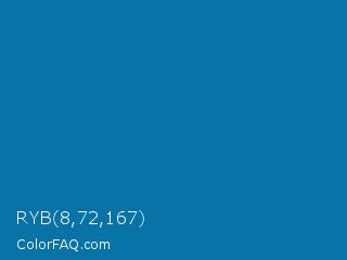 RYB 8,72,167 Color is a normal blue color and the nearest color is Allports #0076a3. Hex code #0873a7 and RGB value is rgb(8,115,167). In RGB color space, this color is composed of 3% red, 45% green, 65% blue, In CMYK color space, this color is composed of 95% cyan, 31% magenta, 0% yellow , 35% black , In HSL color space, this color has a hue angle of 200° , 91% saturation and 34% lightness.