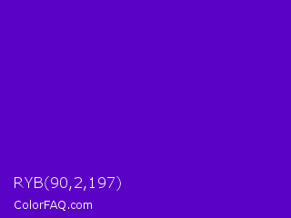RYB 90,2,197 Color is a normal violet color and the nearest color is Interdimensional Blue #360ccc. Hex code #5a02c5 and RGB value is rgb(90,2,197). In RGB color space, this color is composed of 35% red, 1% green, 77% blue, In CMYK color space, this color is composed of 54% cyan, 99% magenta, 0% yellow , 23% black , In HSL color space, this color has a hue angle of 267° , 98% saturation and 39% lightness.