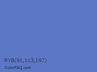 RYB 91,113,197 Color is a normal blue color and the nearest color is Indigo #4f69c6. Hex code #5b77c5 and RGB value is rgb(91,119,197). In RGB color space, this color is composed of 36% red, 47% green, 77% blue, In CMYK color space, this color is composed of 54% cyan, 40% magenta, 0% yellow , 23% black , In HSL color space, this color has a hue angle of 224° , 48% saturation and 56% lightness.