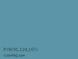 RYB 91,124,167 Color is a normal blue color and the nearest color is Hippie Blue #589aaf. Hex code #5b95a7 and RGB value is rgb(91,149,167). In RGB color space, this color is composed of 36% red, 58% green, 65% blue, In CMYK color space, this color is composed of 46% cyan, 11% magenta, 0% yellow , 35% black , In HSL color space, this color has a hue angle of 194° , 30% saturation and 51% lightness.