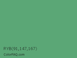 RYB 91,147,167 Color is a normal green color and the nearest color is Aqua Forest #5fa777. Hex code #5ba776 and RGB value is rgb(91,167,118). In RGB color space, this color is composed of 36% red, 65% green, 46% blue, In CMYK color space, this color is composed of 46% cyan, 0% magenta, 29% yellow , 35% black , In HSL color space, this color has a hue angle of 141° , 30% saturation and 51% lightness.