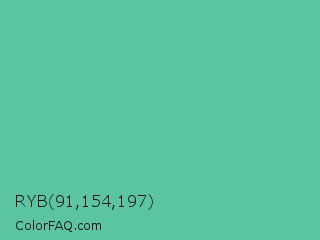 RYB 91,154,197 Color is a normal green color and the nearest color is Tradewind #5fb3ac. Hex code #5bc5a3 and RGB value is rgb(91,197,163). In RGB color space, this color is composed of 36% red, 77% green, 64% blue, In CMYK color space, this color is composed of 54% cyan, 0% magenta, 17% yellow , 23% black , In HSL color space, this color has a hue angle of 161° , 48% saturation and 56% lightness.