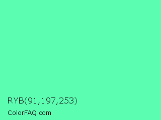 RYB 91,197,253 Color is a light green color and the nearest color is Medium Aquamarine #66ddaa. Hex code #5bfdb1 and RGB value is rgb(91,253,177). In RGB color space, this color is composed of 36% red, 99% green, 69% blue, In CMYK color space, this color is composed of 64% cyan, 0% magenta, 30% yellow , 1% black , In HSL color space, this color has a hue angle of 152° , 98% saturation and 67% lightness.