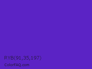 RYB 91,35,197 Color is a normal violet color and the nearest color is Purple Heart Crayola #652dc1. Hex code #5b23c5 and RGB value is rgb(91,35,197). In RGB color space, this color is composed of 36% red, 14% green, 77% blue, In CMYK color space, this color is composed of 54% cyan, 82% magenta, 0% yellow , 23% black , In HSL color space, this color has a hue angle of 261° , 70% saturation and 45% lightness.