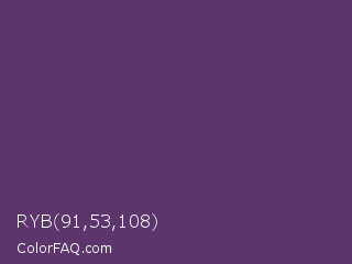 RYB 91,53,108 Color is a normal purple color and the nearest color is Imperial #602f6b. Hex code #5b356c and RGB value is rgb(91,53,108). In RGB color space, this color is composed of 36% red, 21% green, 42% blue, In CMYK color space, this color is composed of 16% cyan, 51% magenta, 0% yellow , 58% black , In HSL color space, this color has a hue angle of 281° , 34% saturation and 32% lightness.