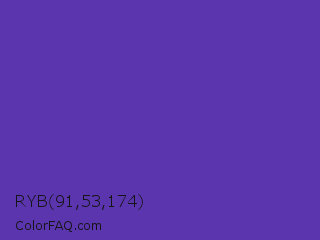 RYB 91,53,174 Color is a normal indigo color and the nearest color is Plump Purple #5946b2. Hex code #5b35ae and RGB value is rgb(91,53,174). In RGB color space, this color is composed of 36% red, 21% green, 68% blue, In CMYK color space, this color is composed of 48% cyan, 70% magenta, 0% yellow , 32% black , In HSL color space, this color has a hue angle of 259° , 53% saturation and 45% lightness.