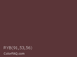 RYB 91,53,56 Color is a dark red color and the nearest color is Congo Brown #593737. Hex code #5b3538 and RGB value is rgb(91,53,56). In RGB color space, this color is composed of 36% red, 21% green, 22% blue, In CMYK color space, this color is composed of 0% cyan, 42% magenta, 38% yellow , 64% black , In HSL color space, this color has a hue angle of 355° , 26% saturation and 28% lightness.