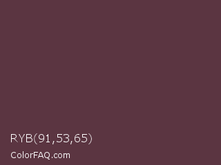 RYB 91,53,65 Color is a dark rose color and the nearest color is Congo Brown #593737. Hex code #5b3541 and RGB value is rgb(91,53,65). In RGB color space, this color is composed of 36% red, 21% green, 25% blue, In CMYK color space, this color is composed of 0% cyan, 42% magenta, 29% yellow , 64% black , In HSL color space, this color has a hue angle of 341° , 26% saturation and 28% lightness.