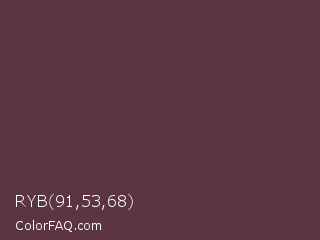 RYB 91,53,68 Color is a dark rose color and the nearest color is Wine Dregs #673147. Hex code #5b3544 and RGB value is rgb(91,53,68). In RGB color space, this color is composed of 36% red, 21% green, 27% blue, In CMYK color space, this color is composed of 0% cyan, 42% magenta, 25% yellow , 64% black , In HSL color space, this color has a hue angle of 336° , 26% saturation and 28% lightness.