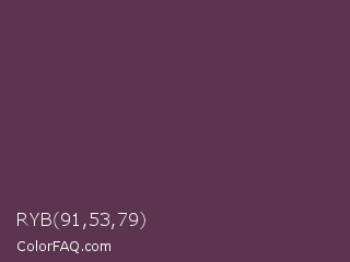 RYB 91,53,79 Color is a dark magenta color and the nearest color is Dark Byzantium #5d3954. Hex code #5b354f and RGB value is rgb(91,53,79). In RGB color space, this color is composed of 36% red, 21% green, 31% blue, In CMYK color space, this color is composed of 0% cyan, 42% magenta, 13% yellow , 64% black , In HSL color space, this color has a hue angle of 319° , 26% saturation and 28% lightness.