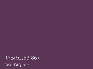 RYB 91,53,86 Color is a dark magenta color and the nearest color is Japanese Violet #5b3256. Hex code #5b3556 and RGB value is rgb(91,53,86). In RGB color space, this color is composed of 36% red, 21% green, 34% blue, In CMYK color space, this color is composed of 0% cyan, 42% magenta, 5% yellow , 64% black , In HSL color space, this color has a hue angle of 308° , 26% saturation and 28% lightness.