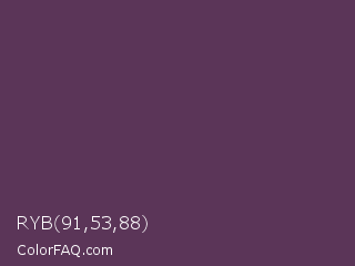 RYB 91,53,88 Color is a dark magenta color and the nearest color is Japanese Violet #5b3256. Hex code #5b3558 and RGB value is rgb(91,53,88). In RGB color space, this color is composed of 36% red, 21% green, 35% blue, In CMYK color space, this color is composed of 0% cyan, 42% magenta, 3% yellow , 64% black , In HSL color space, this color has a hue angle of 305° , 26% saturation and 28% lightness.